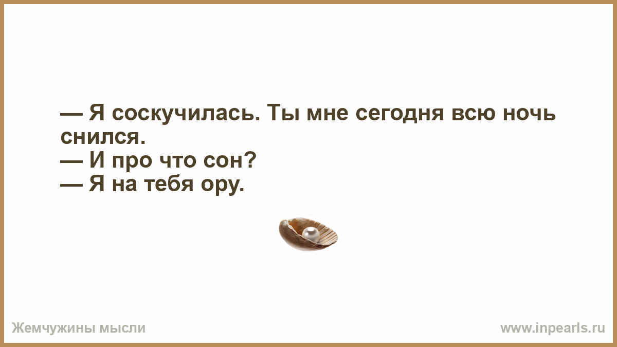 — Я соскучилась. Ты мне сегодня всю ночь снился. — И про что сон? — Я на тебя ору.