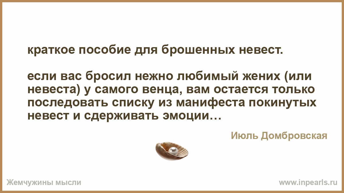 если вас бросил нежно любимый жених (или невеста) у самого венца, вам остается только последовать списку из манифеста покинутых невест и сдерживать эмоции.