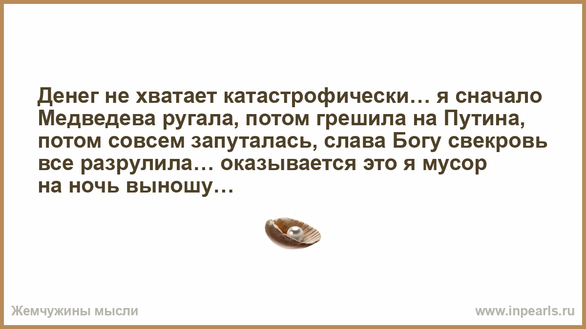 Денег не хватает катастрофически… я сначало Медведева ругала, потом грешила на Путина, потом совсем запуталась, слава Богу свекровь все разрулила… оказывается это я мусор на ночь выношу…