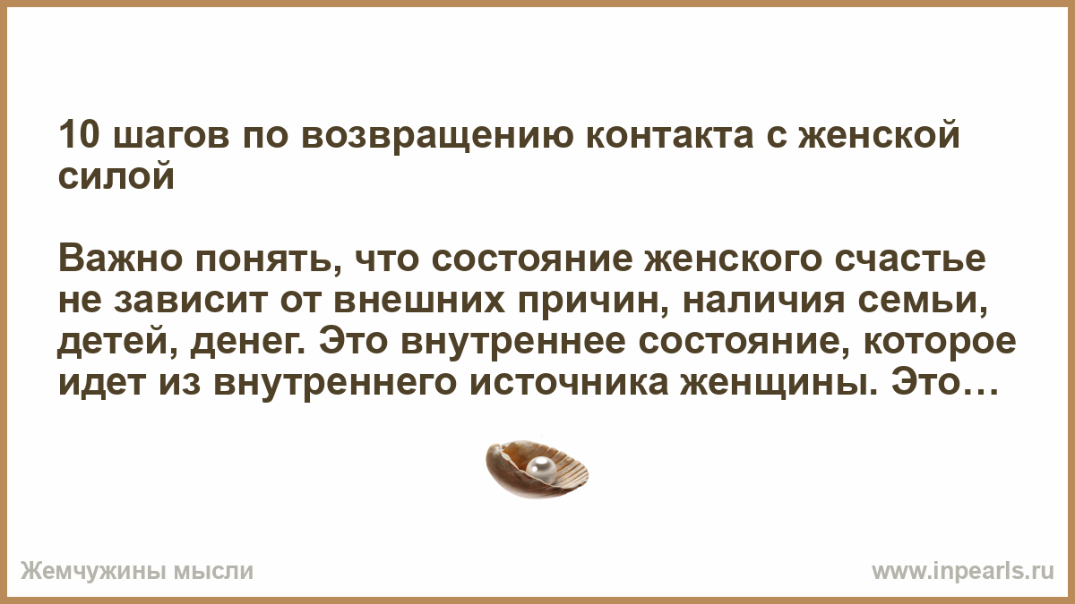 Важно понять, что состояние женского счастье не зависит от внешних причин, наличия семьи, детей, денег. Это внутреннее состояние, которое идет из внутреннего источника женщины. Это состояние беспричинной радости, состояние наполненности, истинной любви к себе. И если у женщины это состояние есть, то все остальное притянется легко и естественно. А если нет, то ни муж, ни дети, ни богатство не сделают ее по- настоящему счастливой.