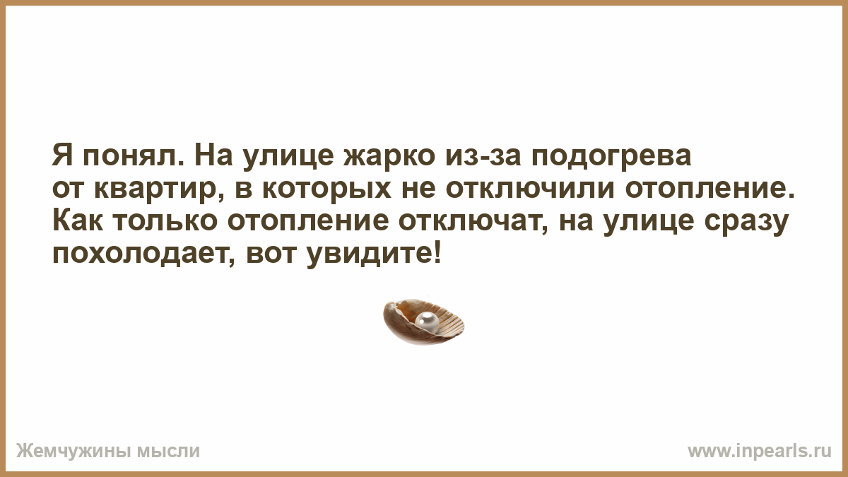 Я понял. На улице жарко из-за подогрева от квартир, в которых не отключили отопление. Как только отопление отключат, на улице сразу похолодает, вот увидите!