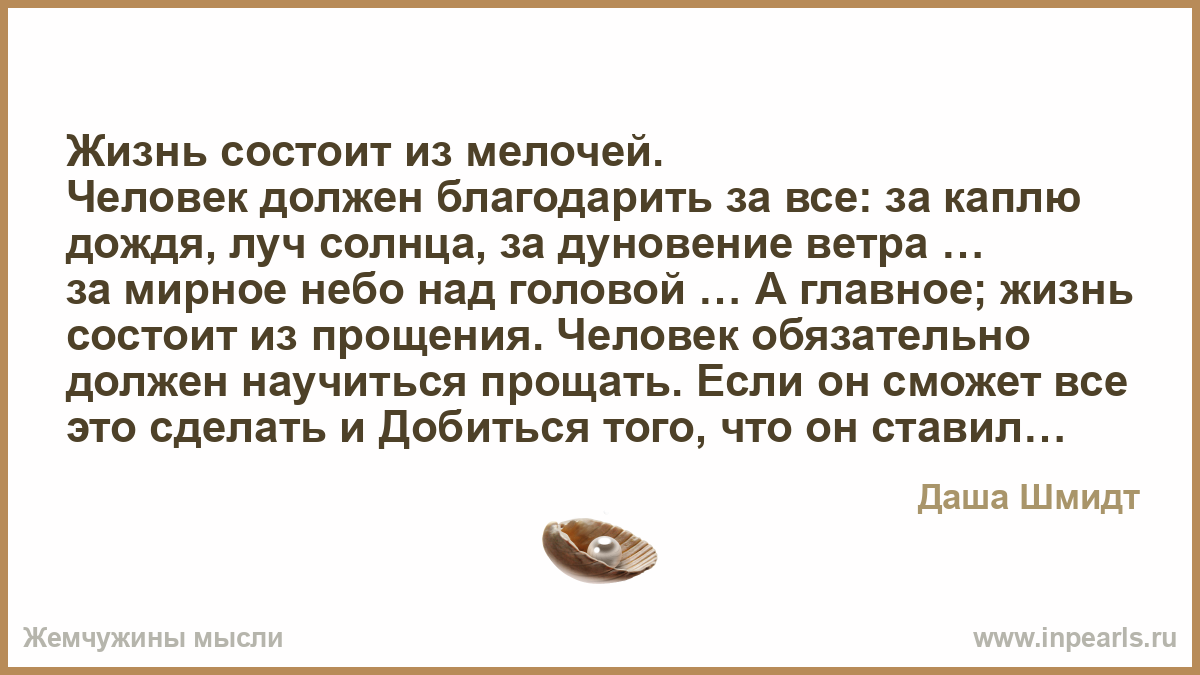 Жизнь состоит из мелочей. Человек должен благодарить за все: за каплю дождя, луч солнца, за дуновение ветра … за мирное небо над головой … А главное; жизнь состоит из прощения. Человек обязательно должен научиться прощать. Если он сможет все это сделать и Добиться того, что он ставил своей целью, то можно сказать, что жизнь прожита не зря!
