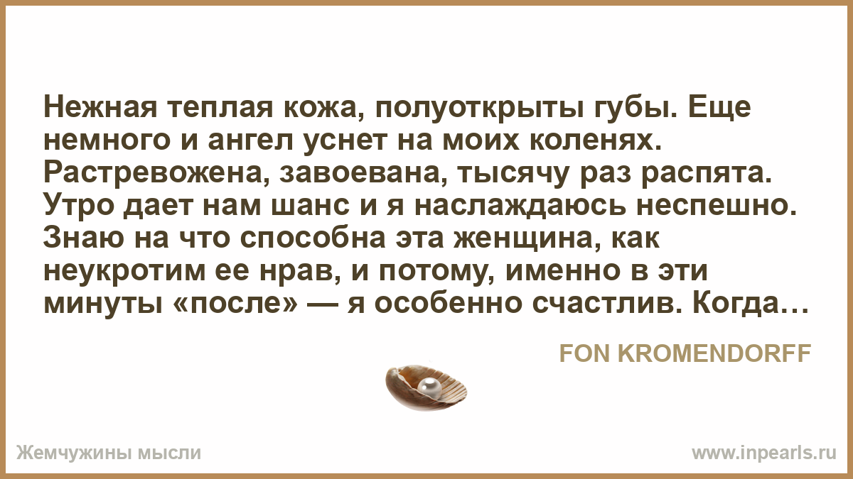 Нежная теплая кожа, полуоткрыты губы. Еще немного и ангел уснет на моих коленях. Растревожена, завоевана, тысячу раз распята. Утро дает нам шанс и я наслаждаюсь неспешно. Знаю на что способна эта женщина, как неукротим ее нрав, и потому, именно в эти минуты «после» — я особенно счастлив. Когда огонь ее глаз сменяется тихим ритмом дыхания. Она не боится обнажить душу сейчас, чтобы я смог прикоснуться к свету. Как же чиста ее душа, как ранима. Я провожу своей грубой, с давнишними шрамами, рукой по ее телу, но словно демонов вижу, что вторят каждому движению моих пальцев. Они впиваются в плоть, оставляя шлейф черных полос.