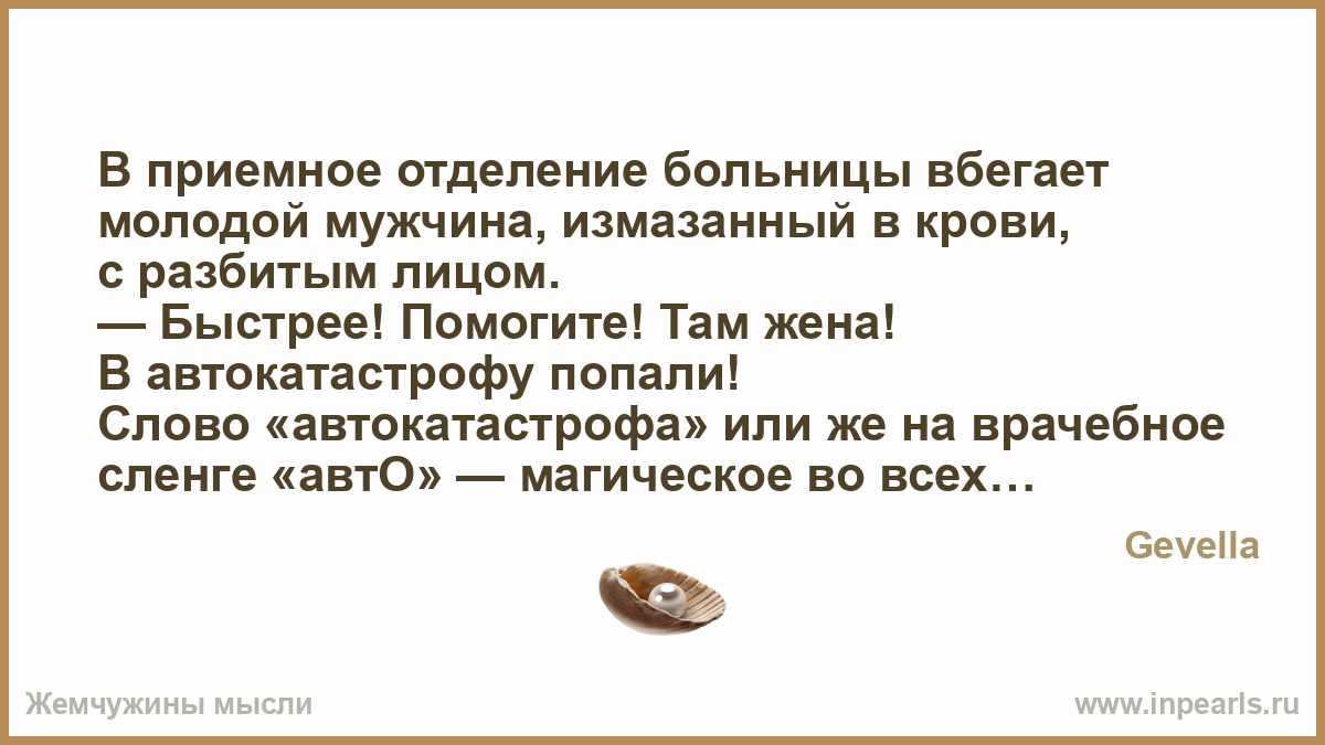 Злое слово «авто» выдернуло всех врачей, сестер, санитарок со своих мест и погнало к выходу, где в синей шахе бомбилы-гастарбайтера на заднем сидении, перепачканная в крови, лежала молодая женщина. Огромный живот женщины, который она придерживала руками, наводил на мысли совершенно страшные. Беременность 8 месяцев. С мужем ехала в маршрутке. На встречку на бешеной скорости выскочил джип, влетел в бок «газели», выкинул на обочину. В салоне маршрутки человеческое месиво, из которого мужчина и вытащил свою беременную жену. Тут же тормознула раздолбананя шаха: «Брат, болныца рядом! Садыс быстрээ, отвэзу!»