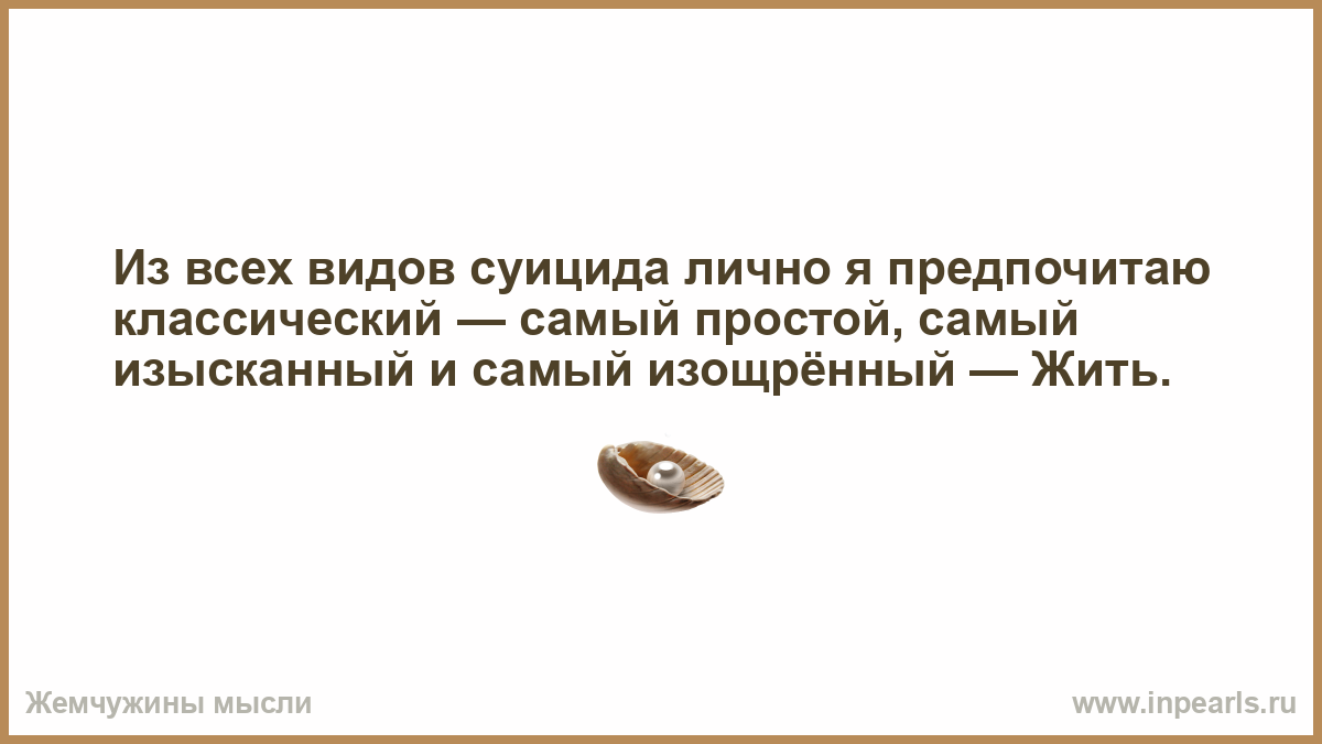 Из всех видов суицида лично я предпочитаю классический — самый простой, самый изысканный и самый изощрённый — Жить.