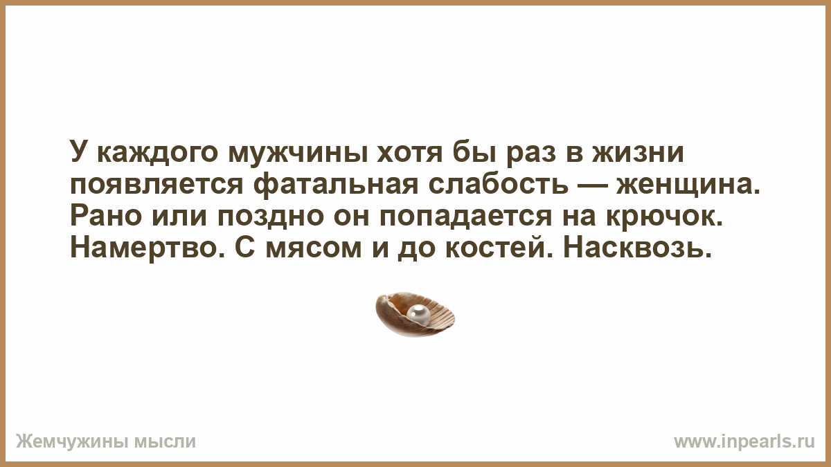 У каждого мужчины хотя бы раз в жизни появляется фатальная слабость — женщина. Рано или поздно он попадается на крючок. Намертво. С мясом и до костей. Насквозь.