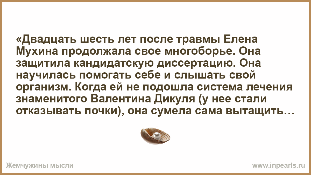 «Двадцать шесть лет после травмы Елена Мухина продолжала свое многоборье. Она защитила кандидатскую диссертацию. Она научилась помогать себе и слышать свой организм. Когда ей не подошла система лечения знаменитого Валентина Дикуля (у нее стали отказывать почки), она сумела сама вытащить себя с того света. Она изучала психологию и парапсихологию и сама помогала людям, попавшим в эмоциональную яму. Она просто жила, ежедневно преодолевая боль. Она никому и никогда не позволяла себя жалеть — если замечала испуганные глаза, смотрящие на нее, прогоняла тут же.»