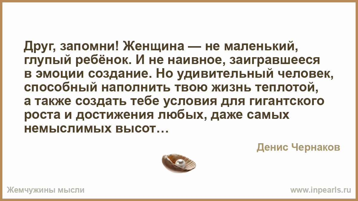 Друг, запомни! Женщина — не маленький, глупый ребёнок. И не наивное, заигравшееся в эмоции создание. Но удивительный человек, способный наполнить твою жизнь теплотой, а также создать тебе условия для гигантского роста и достижения любых, даже самых немыслимых высот.