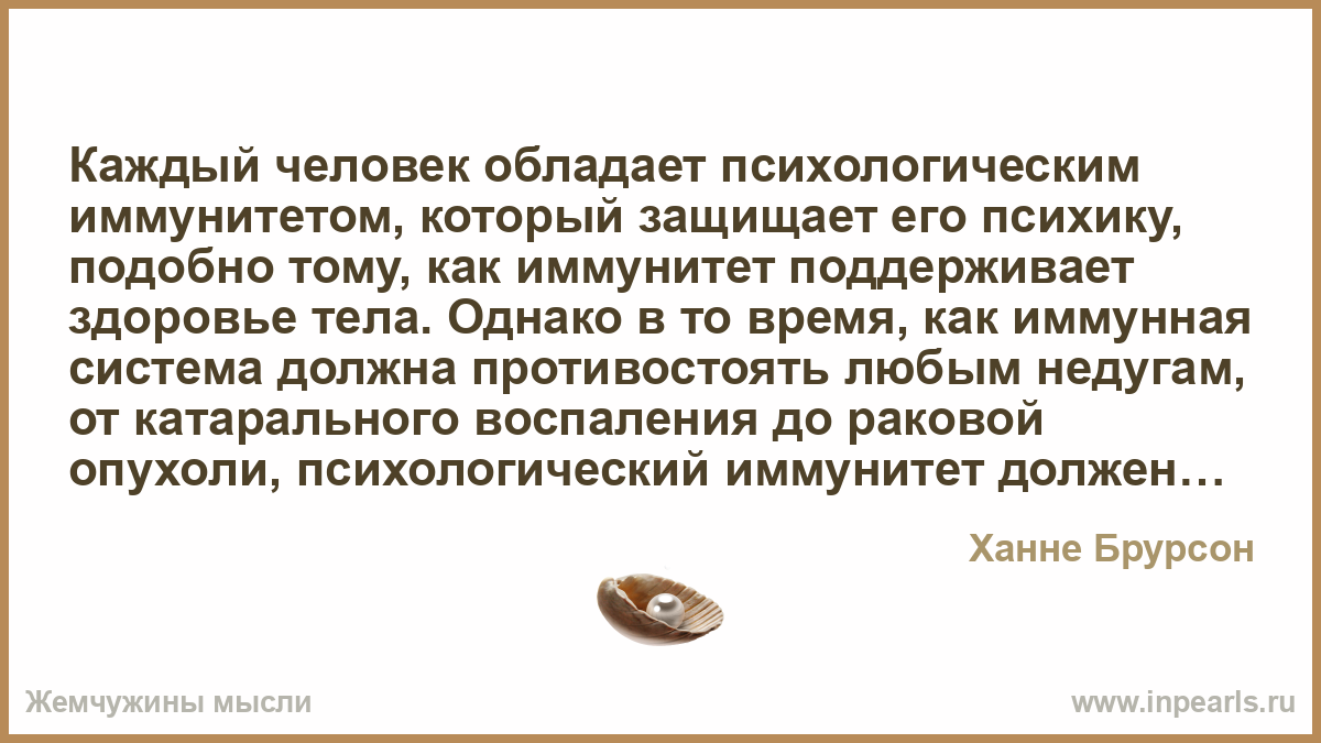 Каждый человек обладает психологическим иммунитетом, который защищает его психику, подобно тому, как иммунитет поддерживает здоровье тела. Однако в то время, как иммунная система должна противостоять любым недугам, от катарального воспаления до раковой опухоли, психологический иммунитет должен справляться со всевозможными напастями и бедами, начиная с небрежно брошенного критического замечания и заканчивая потерей родных и близких. Все по-разному переносят перегрузки. Возможно то, на что вы и вовсе не обратите внимания, способно вызвать депрессию у вашего соседа. Почему все так устроено? …