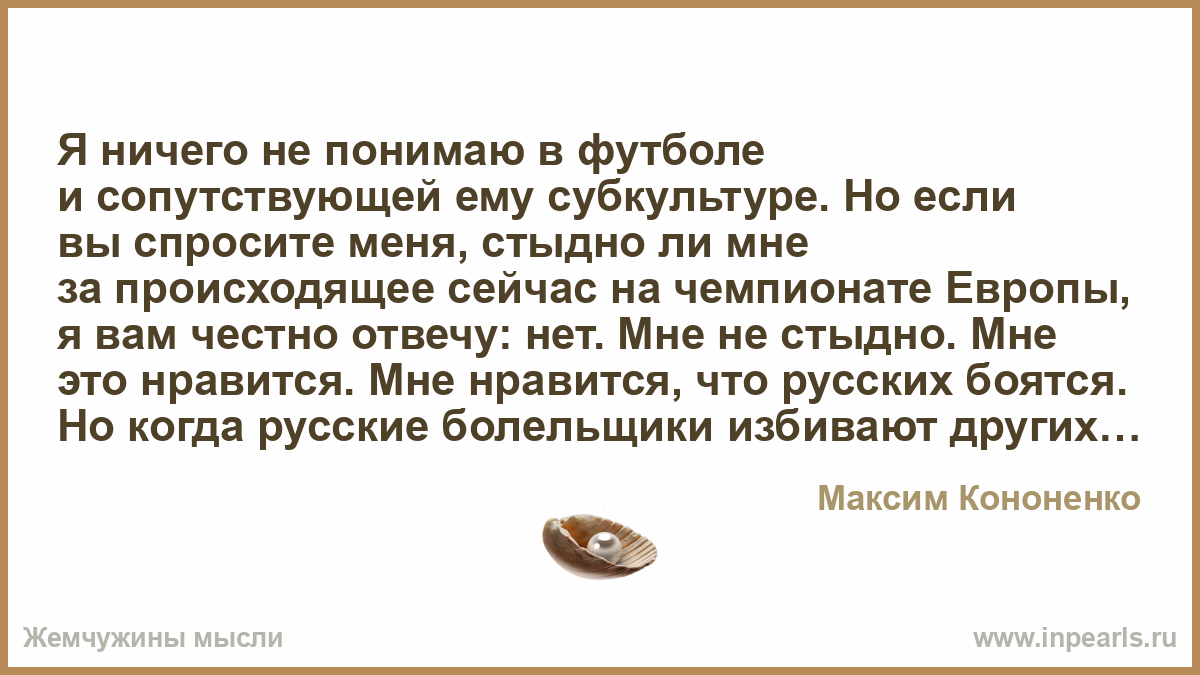 Я ничего не понимаю в футболе и сопутствующей ему субкультуре. Но если вы спросите меня, стыдно ли мне за происходящее сейчас на чемпионате Европы, я вам честно отвечу: нет. Мне не стыдно. Мне это нравится. Мне нравится, что русских боятся.
