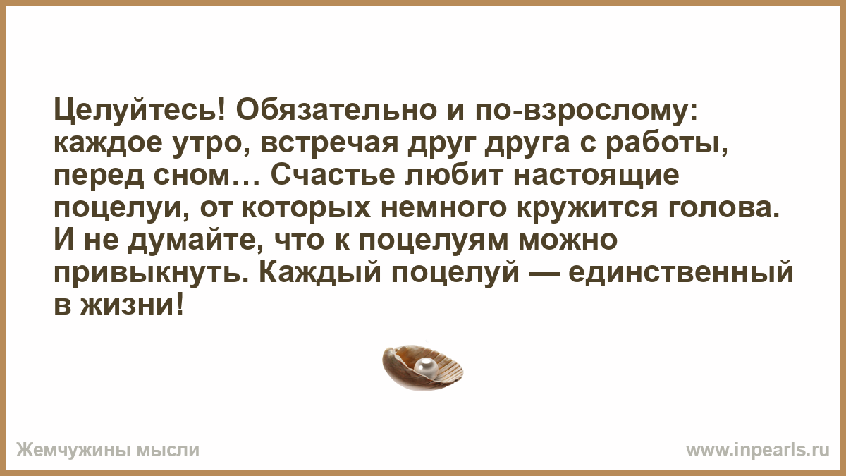 Целуйтесь! Обязательно и по-взрослому: каждое утро, встречая друг друга с работы, перед сном… Счастье любит настоящие поцелуи, от которых немного кружится голова. И не думайте, что к поцелуям можно привыкнуть. Каждый поцелуй — единственный в жизни!