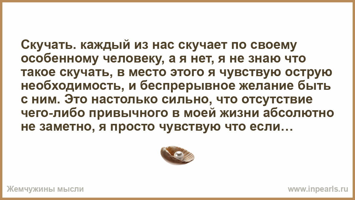 Скучать. каждый из нас скучает по своему особенному человеку, а я нет, я не знаю что такое скучать, в место этого я чувствую острую необходимость, и беспрерывное желание быть с ним. Это настолько сильно, что отсутствие чего-либо привычного в моей жизни абсолютно не заметно, я просто чувствую что если в ближайшее время не увижу его, просто сойду с ума.