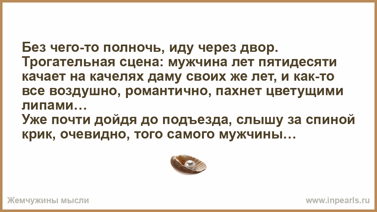 Без чего-то полночь, иду через двор. Трогательная сцена: мужчина лет пятидесяти качает на качелях даму своих же лет, и как-то все воздушно, романтично, пахнет цветущими липами…