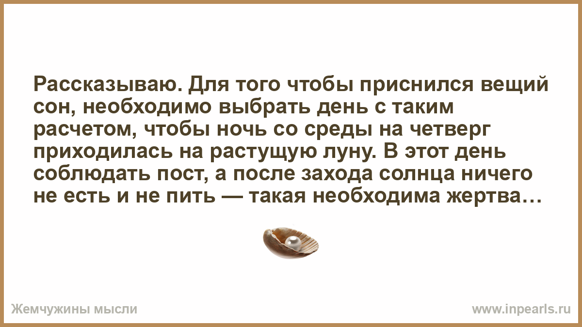 Рассказываю. Для того чтобы приснился вещий сон, необходимо выбрать день с таким расчетом, чтобы ночь со среды на четверг приходилась на растущую луну. В этот день соблюдать пост, а после захода солнца ничего не есть и не пить — такая необходима жертва.