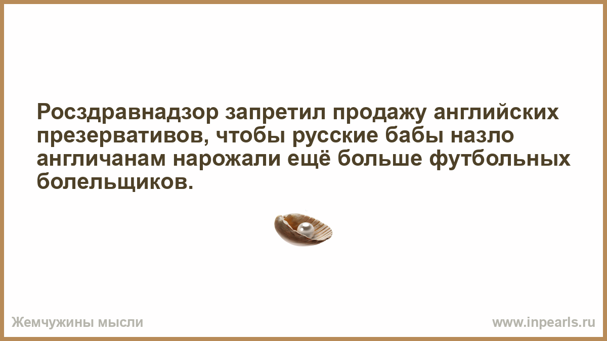 Росздравнадзор запретил продажу английских презервативов, чтобы русские бабы назло англичанам нарожали ещё больше футбольных болельщиков.