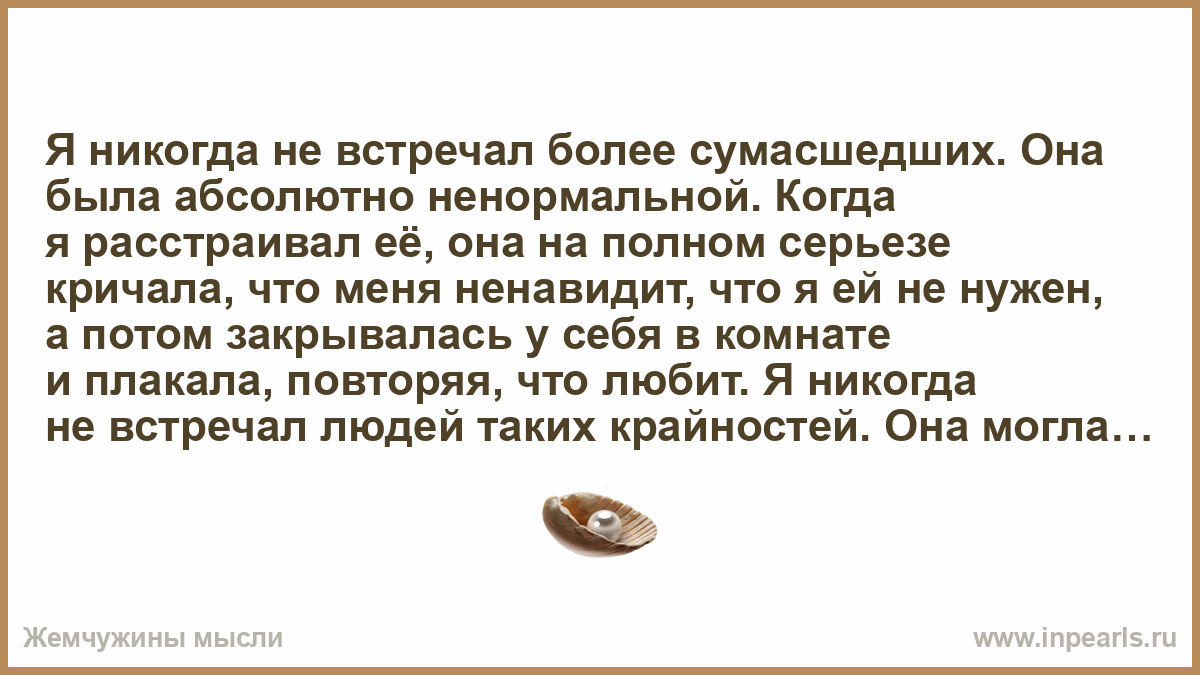 Я никогда не встречал более сумасшедших. Она была абсолютно ненормальной. Когда я расстраивал её, она на полном серьезе кричала, что меня ненавидит, что я ей не нужен, а потом закрывалась у себя в комнате и плакала, повторяя, что любит. Я никогда не встречал людей таких крайностей. Она могла надеть самое дорогое платье и быть невероятно красивой, но оно не имело в её глазах никакой ценности, если, например, я валил её в золотые листья и начинал целовать. Ей было всё равно, что я могу испортить ей причёску или поставить затяжку на чулках, ей было важно лишь то, что она чувствует. Что я чувствую. Я всегда покупал ей большие креветки, а она запивала их чаем. У неё не было понятия «модно» или «принято». Ей было всё равно на то, что кто-то может о ней подумать и сказать. Она не пряталась за этими побрякушками и цацками. Но, если и когда-то надевала их на себя, они не становились для неё выше нас. Я никогда не встречал таких. У неё было только то, что она чувствует. Что я чувствую…
