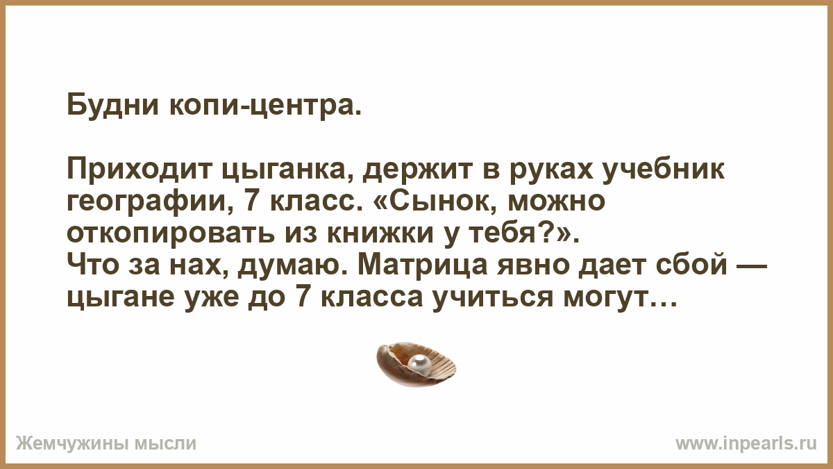 Приходит цыганка, держит в руках учебник географии, 7 класс. «Сынок, можно откопировать из книжки у тебя?».