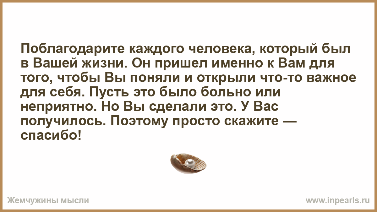 Поблагодарите каждого человека, который был в Вашей жизни. Он пришел именно к Вам для того, чтобы Вы поняли и открыли что-то важное для себя. Пусть это было больно или неприятно. Но Вы сделали это. У Вас получилось. Поэтому просто скажите — спасибо!