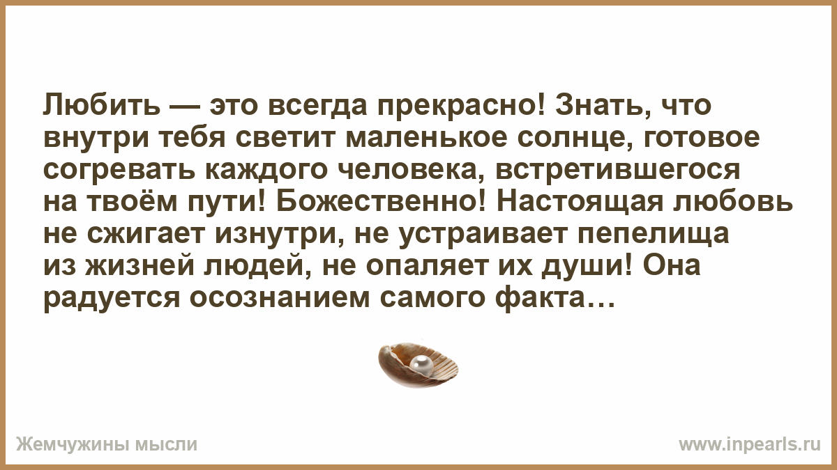 Любить — это всегда прекрасно! Знать, что внутри тебя светит маленькое солнце, готовое согревать каждого человека, встретившегося на твоём пути! Божественно! Настоящая любовь не сжигает изнутри, не устраивает пепелища из жизней людей, не опаляет их души! Она радуется осознанием самого факта существования на Земле любимого человека! Для истинной любви взаимность не является обязательным условием! Любовь дарит, а не обкрадывает! Она всегда готова уступить и отойти в сторону, а не мучать своим присутствием или бесконечным напоминанием о себе! Любовь — это, в первую очередь, очищенное от собственного эгоизма желание счастья любимому человеку! Любовь никогда не торгуется и не ставит своих условий! Она не знает гордости, её невозможно унизить или втоптать в грязь! Любовь испытывает глубокое уважение к правам и свободам другого человека и не нарушает его границ! Она не оправдывается и не стыдится своего проявления! Не пытается очаровать или пленить собой! Любовь не ищет своего, а потому — не манипулирует возлюбленным! Истинная любовь принимает любые условия, но она никогда не толкает людей на безумства и саморазрушения! Любовь ничем не жертвует и не ждёт от любимого никаких жертв взамен, но всегда дарит! Любящий чувствует глубокую благодарность к любимому уже за саму возможность испытывать эти светлые чувства, которые помогают ему становиться добрее и сильнее! Любовь оберегает свободу другого человека и защищает от своих собственных посягательств на неё! Она не способна навредить: причинить зло или боль возлюбленному! Носящий любовь в своём сердце умеет прощать! Любящий никогда не ждёт, не надеется и ничего не ожидает! Он просто живёт и любит, не смотря ни на что, а часто и вопреки всему!