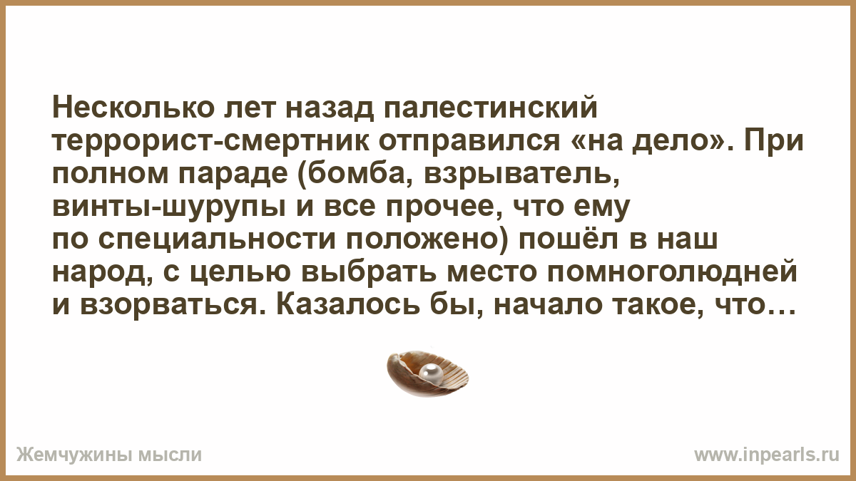 Несколько лет назад палестинский террорист-смертник отправился «на дело». При полном параде (бомба, взрыватель, винты-шурупы и все прочее, что ему по специальности положено) пошёл в наш народ, с целью выбрать место помноголюдней и взорваться. Казалось бы, начало такое, что не предвещает смеха даже отъявленному антисемиту. Неизвестно, какой была квалификация того героя палестинского народа, только рабочим местом он выбрал не абы что, а одно из самых оживленных мест Иерусалима. Огляделся, пристроился среди толпы и нажал на взрыватель. Но у Всевышнего, судя по всему, были другие планы на день.