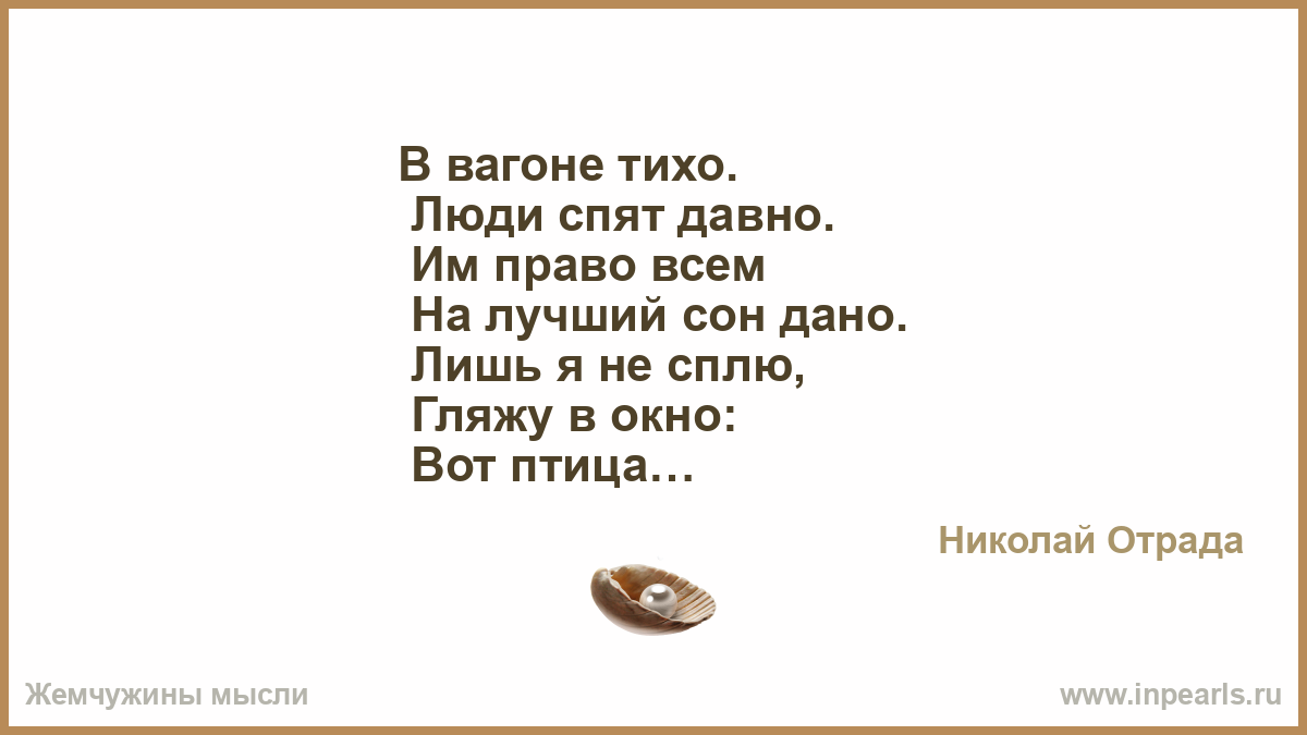 Его жена внезапно умерла… А он сидел до самого восхода, Все повторяя: «Как же ты могла?!» Перебирая вещи из комода… Глядел на тонкий шелк и кружева, Лет пять лежали вещи — не носила, «Все берегла… пока была жива… Куском обычной ткани дорожила… На всякий случай… Вот он и пришел! Загадываешь чуда, ждешь, мечтаешь… А кто-то взял… и за руку увёл! Особый случай — день, что проживаешь! Не оставлять на завтра! Жить сейчас! И не беречь посуду и одежду! Не доедать, не прятать про запас! И быть все время вместе, а не между… Беречь живой огонь любимых глаз, И каждый жест, и каждую улыбку, Все узелки, что связывают вас… Чтоб не жалеть, что совершил ошибку…»