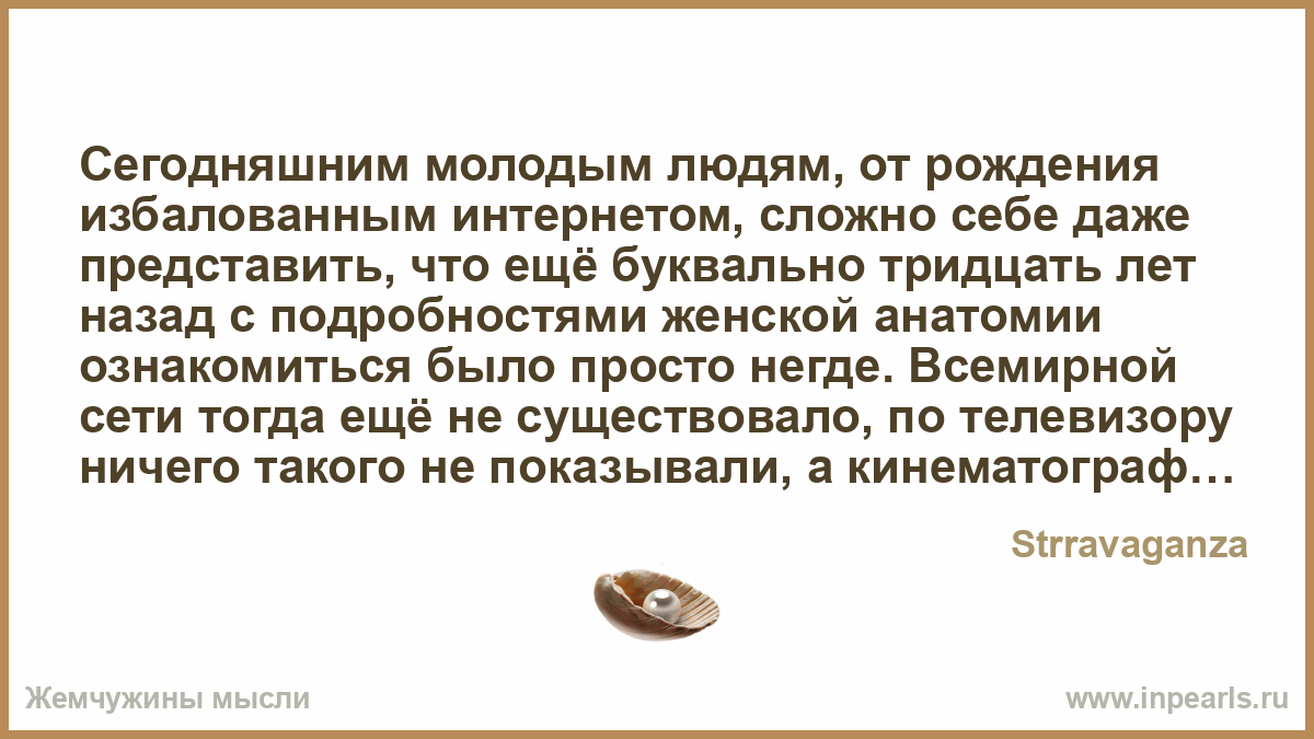 Сегодняшним молодым людям, от рождения избалованным интернетом, сложно себе даже представить, что ещё буквально тридцать лет назад с подробностями женской анатомии ознакомиться было просто негде. Всемирной сети тогда ещё не существовало, по телевизору ничего такого не показывали, а кинематограф СССР мало того, что был целомудрен, как старая дева, так ещё и отсекал страждущих возрастным цензом «Детям до шестнадцати».