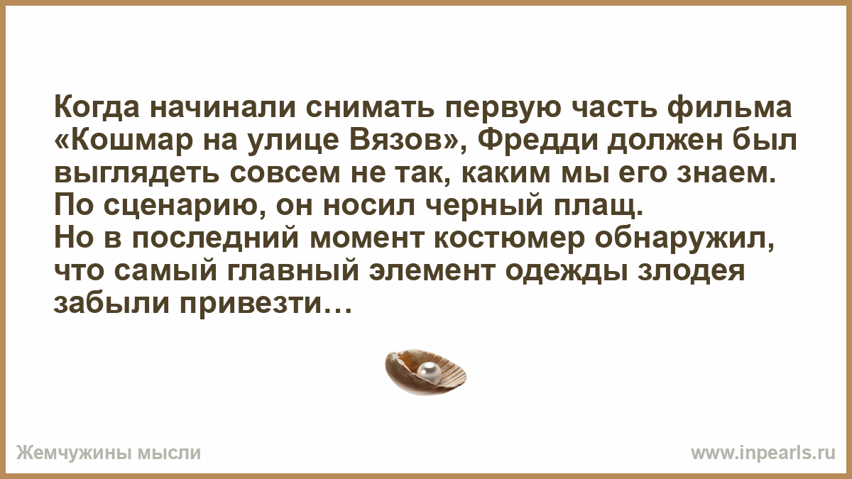 Когда начинали снимать первую часть фильма «Кошмар на улице Вязов», Фредди должен был выглядеть совсем не так, каким мы его знаем. По сценарию, он носил черный плащ. Но в последний момент костюмер обнаружил, что самый главный элемент одежды злодея забыли привезти.
