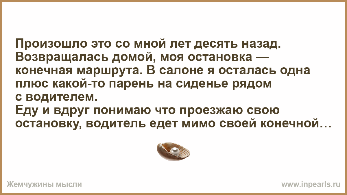 Произошло это со мной лет десять назад. Возвращалась домой, моя остановка — конечная маршрута. В салоне я осталась одна плюс какой-то парень на сиденье рядом с водителем.