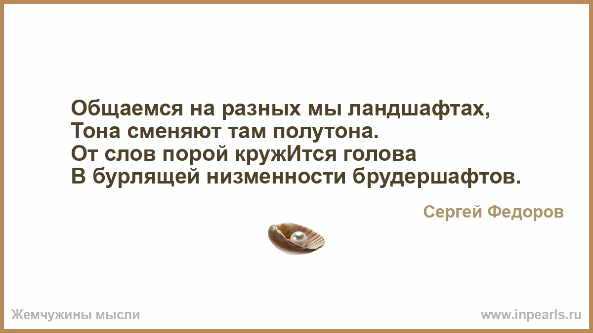 Общаемся на разных мы ландшафтах, Тона сменяют там полутона. От слов порой кружИтся голова В бурлящей низменности брудершафтов.