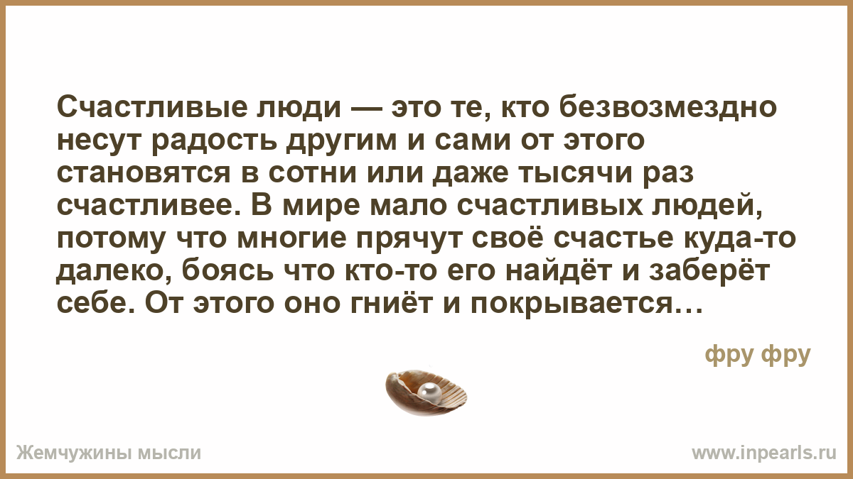 Счастливые люди — это те, кто безвозмездно несут радость другим и сами от этого становятся в сотни или даже тысячи раз счастливее. В мире мало счастливых людей, потому что многие прячут своё счастье куда-то далеко, боясь что кто-то его найдёт и заберёт себе. От этого оно гниёт и покрывается противной плесенью, от которой счастье уже не спасти. Так и погибает счастье вместе с хозяином. Глупо и просто, от мерзкой жадности и скупости на искренние, тёплые чувства, которые способны пробудить надежду в опустившем руки, поднять с колен жалкого, озарить улыбкой отчаявшегося, сделать счастливее и без того счастливого, доказать на деле слова, сказанные в порыве тех же самых чувств, убедить кого-то и самому убедиться в чём-то, что без чувств доказать нельзя.