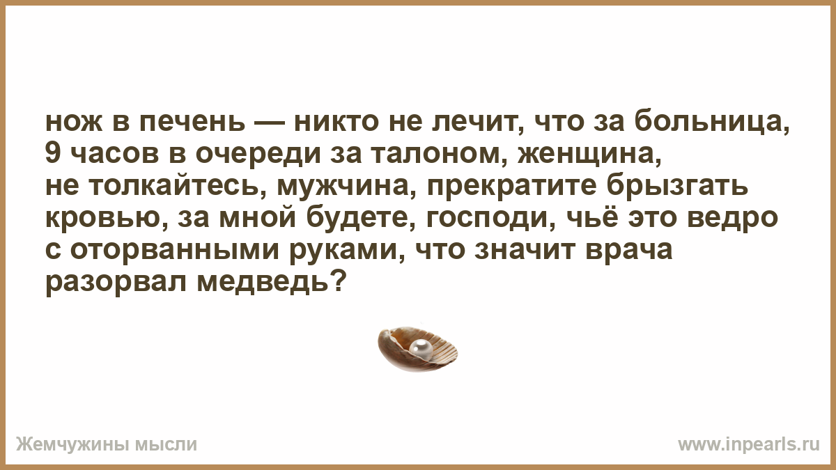 нож в печень — никто не лечит, что за больница, 9 часов в очереди за талоном, женщина, не толкайтесь, мужчина, прекратите брызгать кровью, за мной будете, господи, чьё это ведро с оторванными руками, что значит врача разорвал медведь?