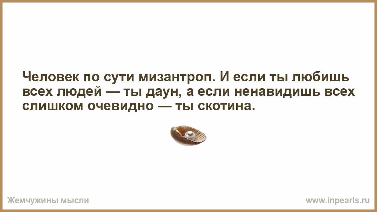 Человек по сути мизантроп. И если ты любишь всех людей — ты даун, а если ненавидишь всех слишком очевидно — ты скотина.