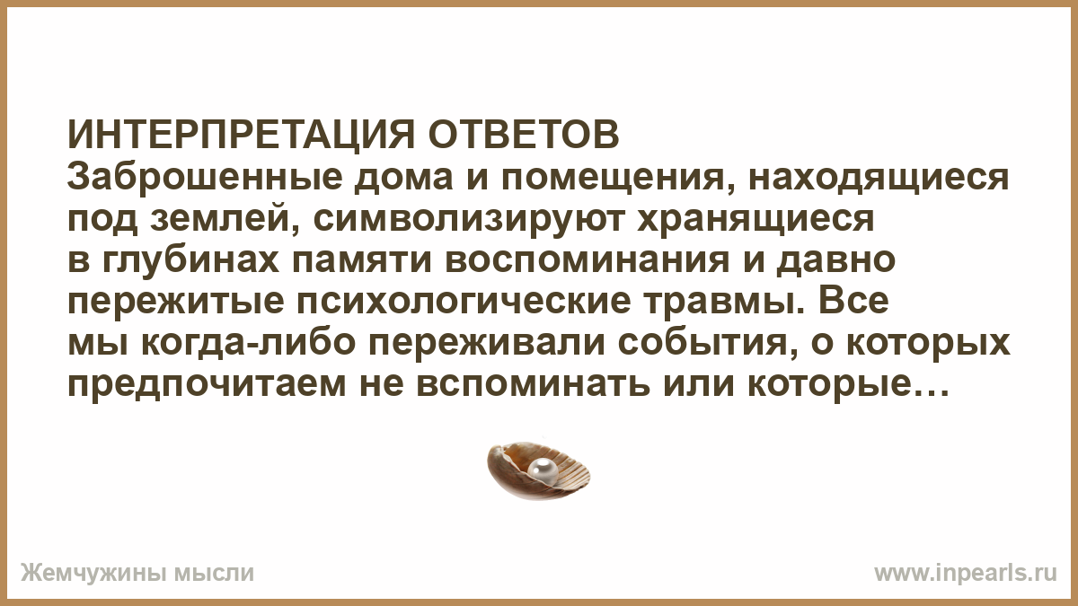 Заброшенные дома и помещения, находящиеся под землей, символизируют хранящиеся в глубинах памяти воспоминания и давно пережитые психологические травмы. Все мы когда-либо переживали события, о которых предпочитаем не вспоминать или которые доставили столько неприятностей, что нам кажется, будто они давно забыты. Но пережитое не так-то легко стереть из памяти, и то, что мы считали забытым, продолжает оставаться в нас в течение гораздо большего времени, чем мы предполагаем. Твоя реакция на эту ситуацию и ответы на вопросы свидетельствуют о том, каким образом ты обычно справляешься с печальными и болезненными воспоминаниями из своего прошлого.