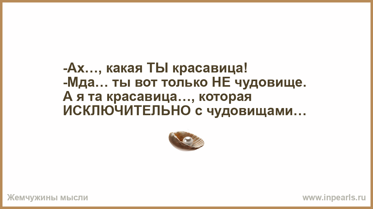 -Ах…, какая ТЫ красавица! -Мда… ты вот только НЕ чудовище. А я та красавица…, которая ИСКЛЮЧИТЕЛЬНО с чудовищами…