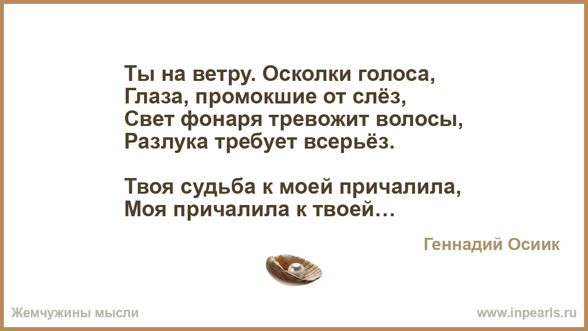 Его жена внезапно умерла… А он сидел до самого восхода, Все повторяя: «Как же ты могла?!» Перебирая вещи из комода… Глядел на тонкий шелк и кружева, Лет пять лежали вещи — не носила, «Все берегла… пока была жива… Куском обычной ткани дорожила… На всякий случай… Вот он и пришел! Загадываешь чуда, ждешь, мечтаешь… А кто-то взял… и за руку увёл! Особый случай — день, что проживаешь! Не оставлять на завтра! Жить сейчас! И не беречь посуду и одежду! Не доедать, не прятать про запас! И быть все время вместе, а не между… Беречь живой огонь любимых глаз, И каждый жест, и каждую улыбку, Все узелки, что связывают вас… Чтоб не жалеть, что совершил ошибку…»