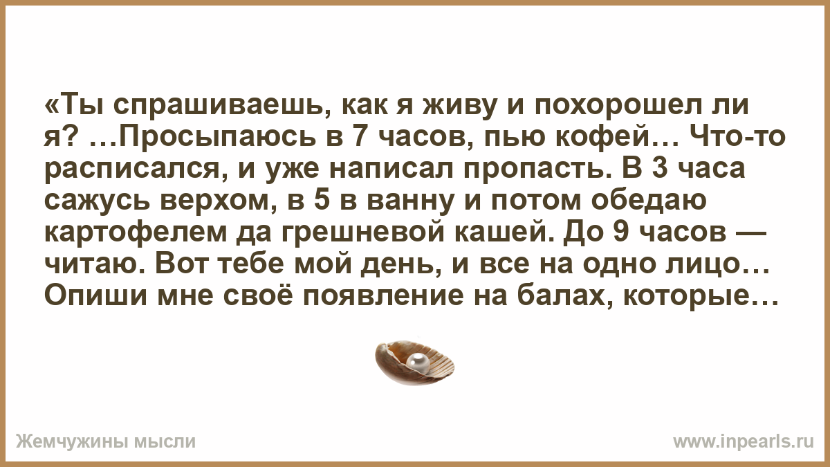 «Ты спрашиваешь, как я живу и похорошел ли я? …Просыпаюсь в 7 часов, пью кофей… Что-то расписался, и уже написал пропасть. В 3 часа сажусь верхом, в 5 в ванну и потом обедаю картофелем да грешневой кашей. До 9 часов — читаю. Вот тебе мой день, и все на одно лицо… Опиши мне своё появление на балах, которые, как ты пишешь, вероятно уже открылись — да, ангел мой, пожалуйста, не кокетничай. Я не ревнив, да и знаю, что ты во все тяжкое не пустишься; но ты знаешь, как я не люблю всё, что пахнет московской барышней, всё, что не comme il faut, всё, что vulgar… Если при моем возвращении я найду, что твой милый простой, аристократичный тон изменился, разведусь, вот те Христос, и пойду в солдаты с горя».