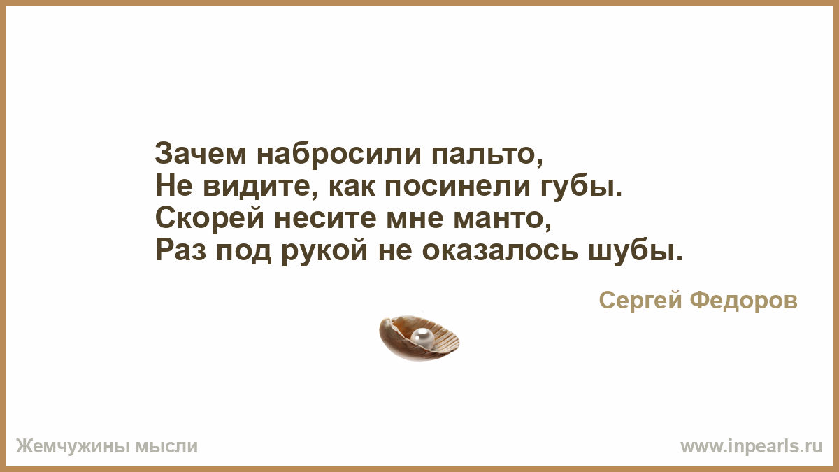 Зачем набросили пальто, Не видите, как посинели губы. Скорей несите мне манто, Раз под рукой не оказалось шубы.