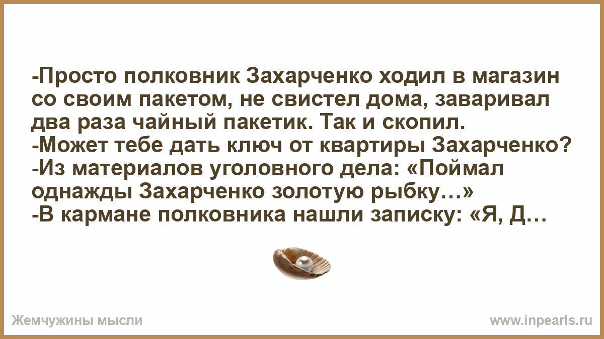 -Просто полковник Захарченко ходил в магазин со своим пакетом, не свистел дома, заваривал два раза чайный пакетик. Так и скопил.