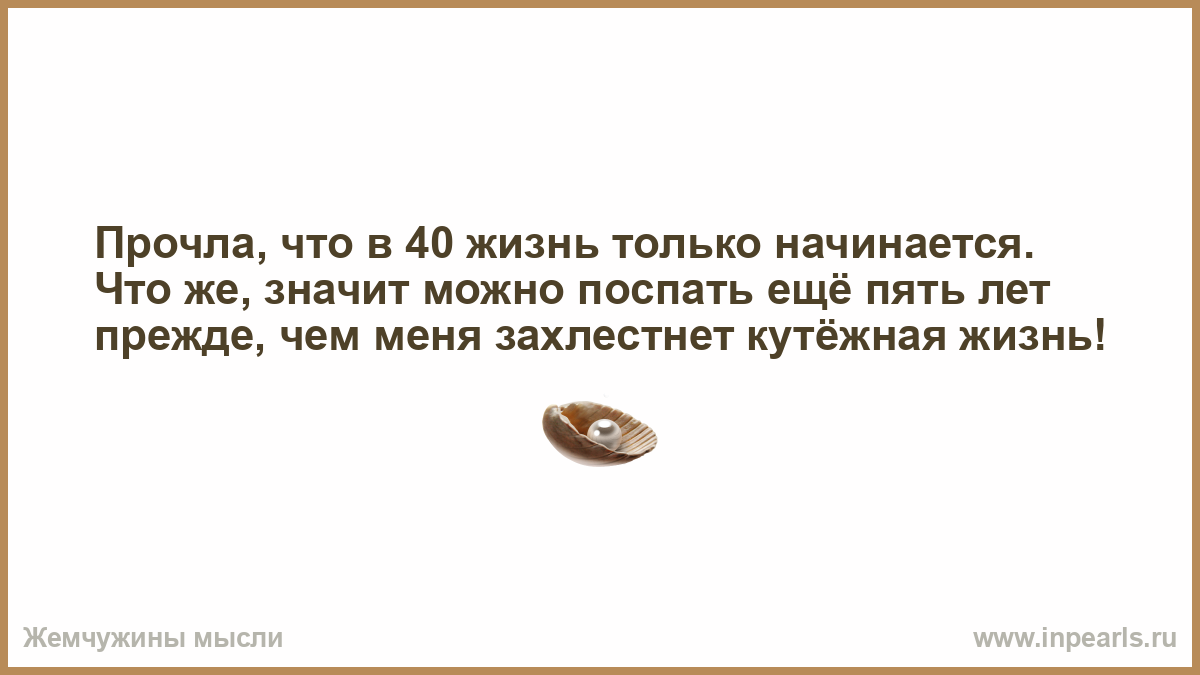Прочла, что в 40 жизнь только начинается. Что же, значит можно поспать ещё пять лет прежде, чем меня захлестнет кутёжная жизнь!