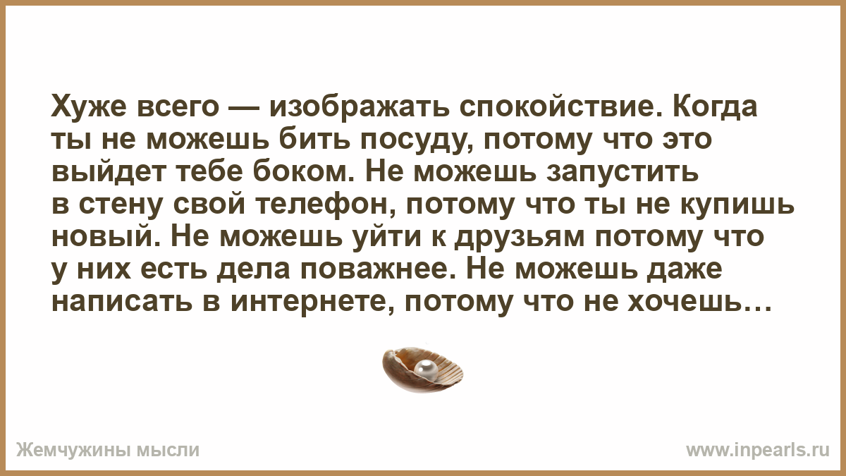 Хуже всего — изображать спокойствие. Когда ты не можешь бить посуду, потому что это выйдет тебе боком. Не можешь запустить в стену свой телефон, потому что ты не купишь новый. Не можешь уйти к друзьям потому что у них есть дела поважнее. Не можешь даже написать в интернете, потому что не хочешь показухи и жалости. И всё, что тебе дозволено — поедать себя морально изнутри.