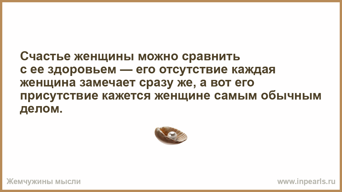 Счастье женщины можно сравнить с ее здоровьем — его отсутствие каждая женщина замечает сразу же, а вот его присутствие кажется женщине самым обычным делом.