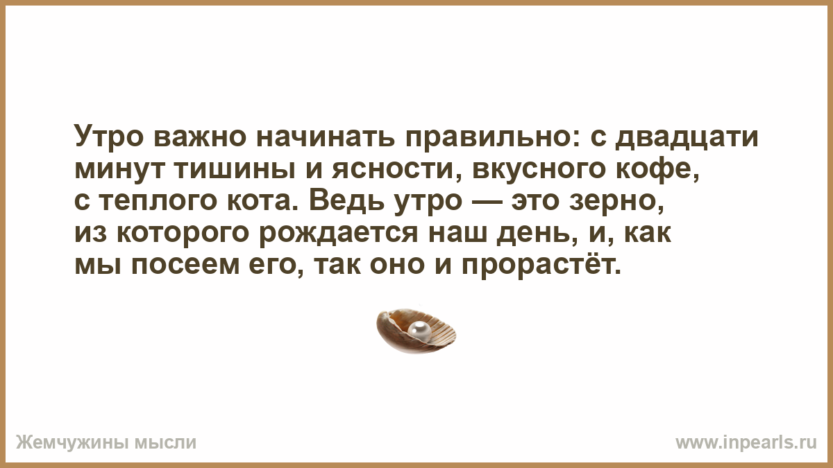Утро важно начинать правильно: с двадцати минут тишины и ясности, вкусного кофе, с теплого кота. Ведь утро — это зерно, из которого рождается наш день, и, как мы посеем его, так оно и прорастёт.