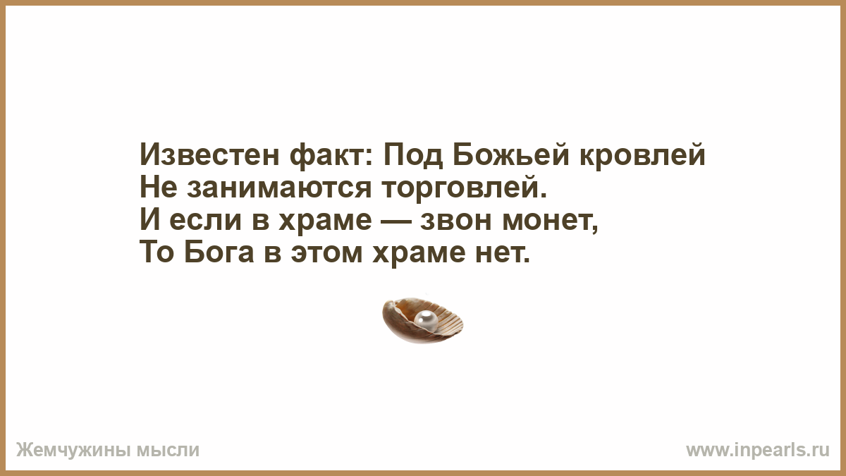Известен факт: Под Божьей кровлей Не занимаются торговлей. И если в храме — звон монет, То Бога в этом храме нет.