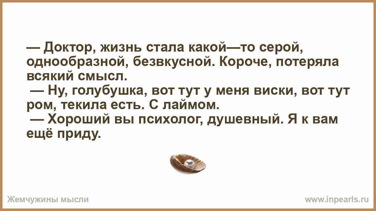 — Доктор, жизнь стала какой—то серой, однообразной, безвкусной. Короче, потеряла всякий смысл. — Ну, голубушка, вот тут у меня виски, вот тут ром, текила есть. С лаймом. — Хороший вы психолог, душевный. Я к вам ещё приду.