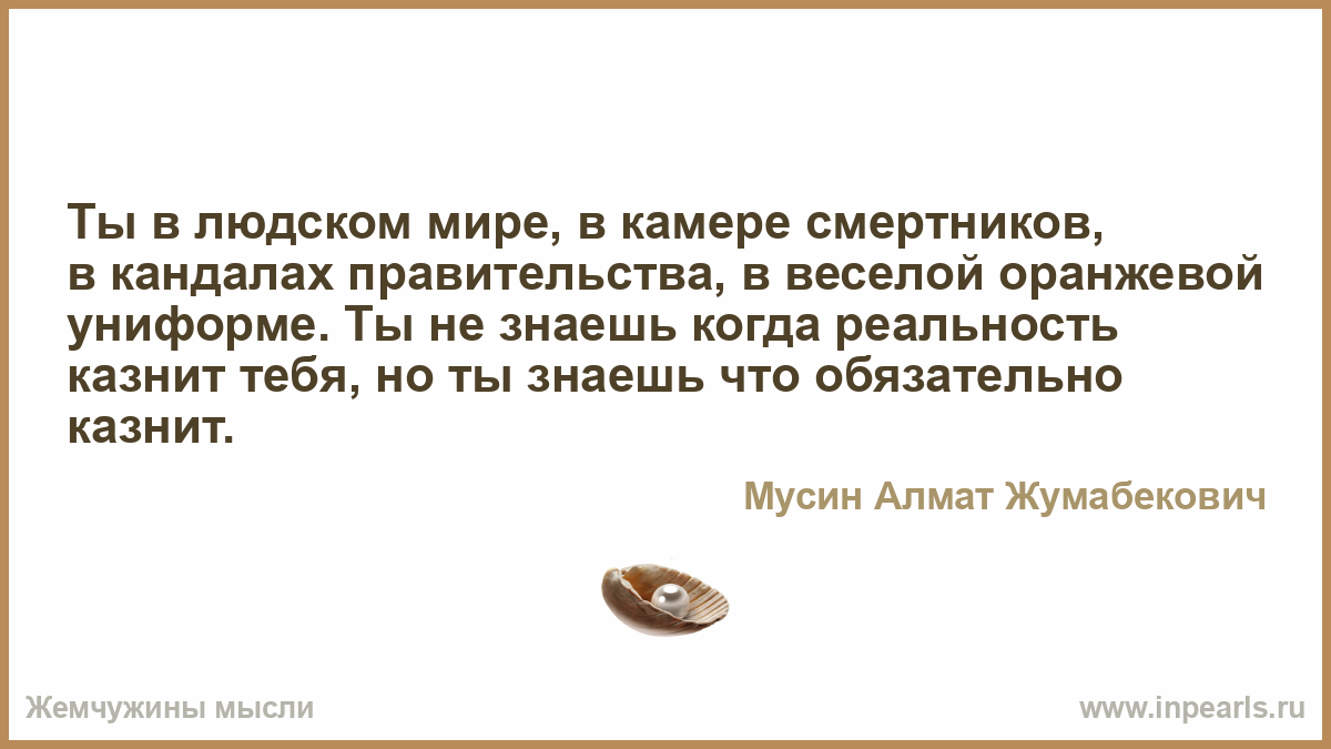Ты в людском мире, в камере смертников, в кандалах правительства, в веселой оранжевой униформе. Ты не знаешь когда реальность казнит тебя, но ты знаешь что обязательно казнит.