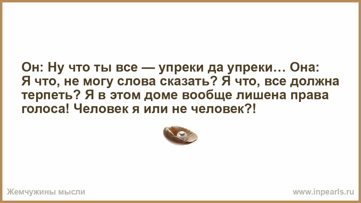 Он: Ну что ты все — упреки да упреки… Она: Я что, не могу слова сказать? Я что, все должна терпеть? Я в этом доме вообще лишена права голоса! Человек я или не человек?!
