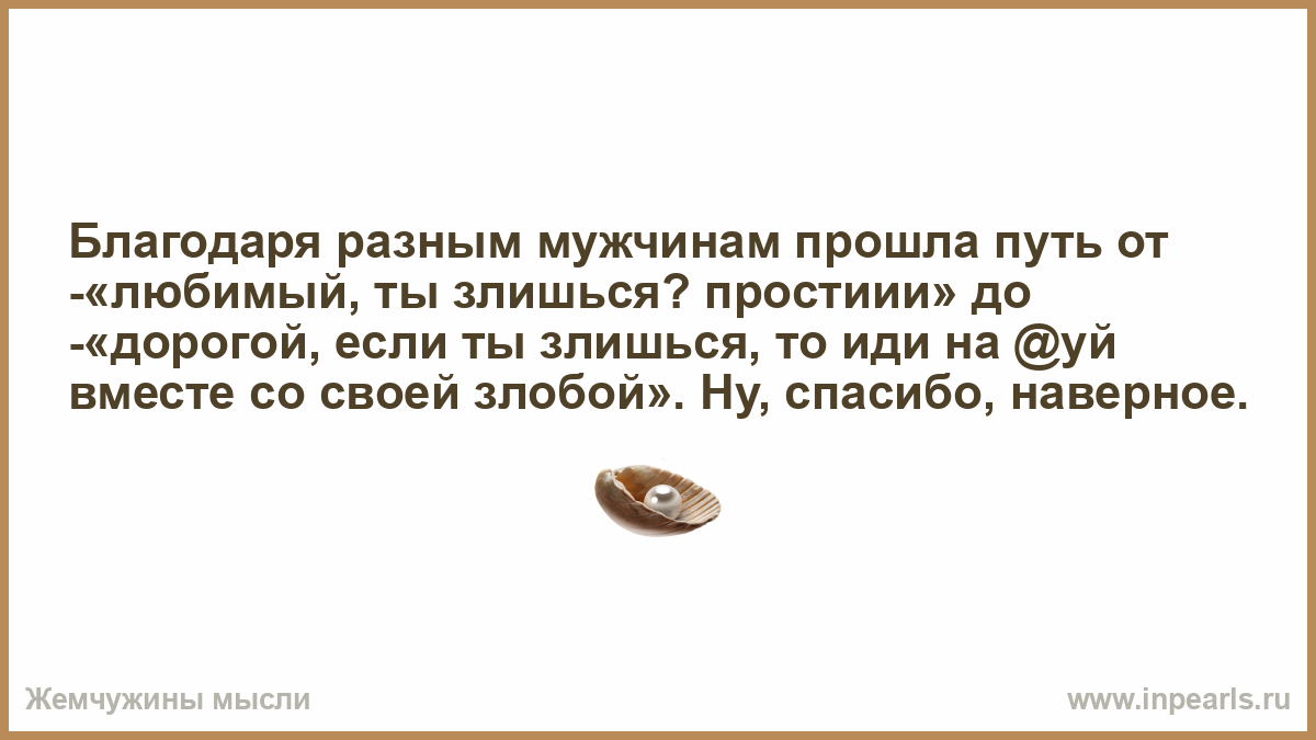 Благодаря разным мужчинам прошла путь от -«любимый, ты злишься? простиии» до -«дорогой, если ты злишься, то иди на @уй вместе со своей злобой». Ну, спасибо, наверное.