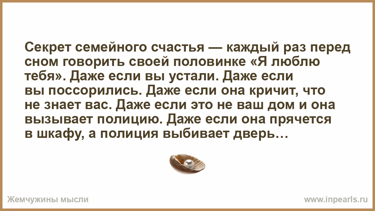 Секрет семейного счастья — каждый раз перед сном говорить своей половинке «Я люблю тебя». Даже если вы устали. Даже если вы поссорились. Даже если она кричит, что не знает вас. Даже если это не ваш дом и она вызывает полицию. Даже если она прячется в шкафу, а полиция выбивает дверь…