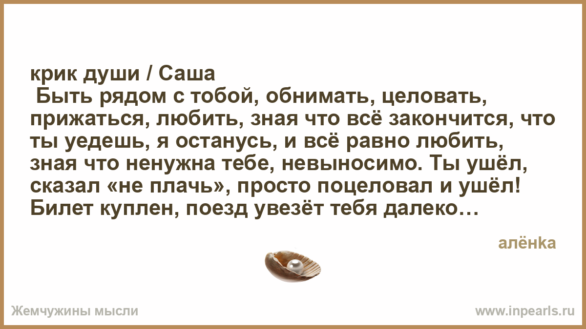 Быть рядом с тобой, обнимать, целовать, прижаться, любить, зная что всё закончится, что ты уедешь, я останусь, и всё равно любить, зная что ненужна тебе, невыносимо. Ты ушёл, сказал «не плачь», просто поцеловал и ушёл! Билет куплен, поезд увезёт тебя далеко, мы больше не увидимся, никогда!!! Ты ушёл!, я закрыла дверь и. .. и умерла. Хочется кричать!, вернуть тебя, сказать «я люблю тебя», снова целовать прижимаясь к тебе.. . Но этого больше не будет.. . Я люблю тебя, Саша! Люблю!