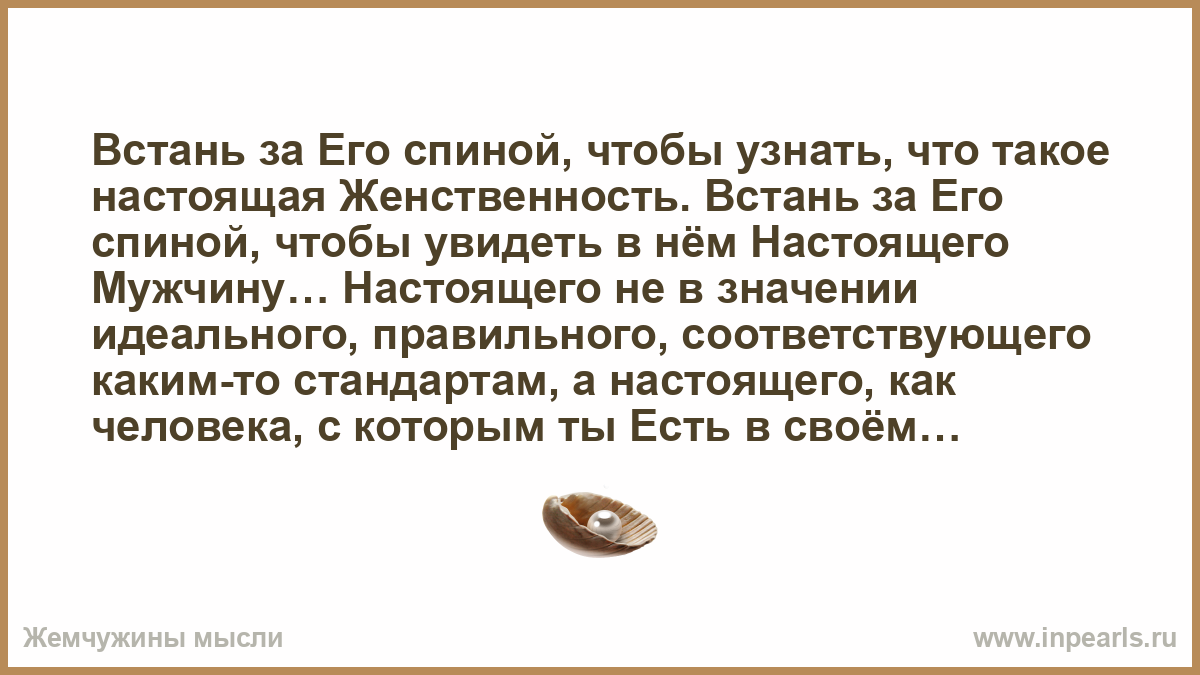 Встань за Его спиной, чтобы узнать, что такое настоящая Женственность. Встань за Его спиной, чтобы увидеть в нём Настоящего Мужчину… Настоящего не в значении идеального, правильного, соответствующего каким-то стандартам, а настоящего, как человека, с которым ты Есть в своём Настоящем. Встань за Его спиной. Позволь Ему Быть Мужчиной, позволь Ему расправить крылья и взять ответственность. Он справится. Он сможет. Он покажет тебе неизведанные дали, проведёт тебя потайными тропками к твоей позабытой, стихийной и неистовой, жаркой, природной Женственности… Он будет делать больно — больно твоему Эго, самолюбию, всезнайству, той части тебя, которая возомнила, что всё знает и умеет, что со всем справится — «Я сама». Он заставит тебя сдаться и поднять белый флаг Мира с цветами роз Любви и Доверия. Только позволь Ему — встань за Его спиной… Рассмотри широту его плеч как проявление широты и размаха Его Любви. Прикоснись к Его груди и услышь биение Его Сердца как биение самой Жизни, пульсацию Источника. Путь Пары… Почувствуй, что у Него внутри. Не нужно слов, расспрашиваний — учись чувствовать Его. Учись улавливать Его волну, ведь и ты тоже волна. Соединитесь вместе в танце, в движении Волны, в дыхании Ветра, в сиянии Солнца, в пламени Огня… И Он откроется тебе другим… Он одарит тебя несметными Дарами, богатством несравнимым ни с золотом, ни с бриллиантами… Он подарит тебе счастье Быть Женщиной, Любящей и Любимой…